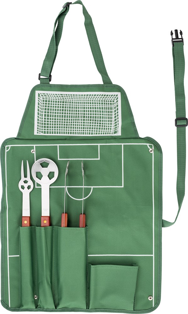 Vierdelige voetbal barbecue set, inclusief groen schort met witte opdruk zoals een voetbalveld en een spatel, vork en tang met houten handvatten.